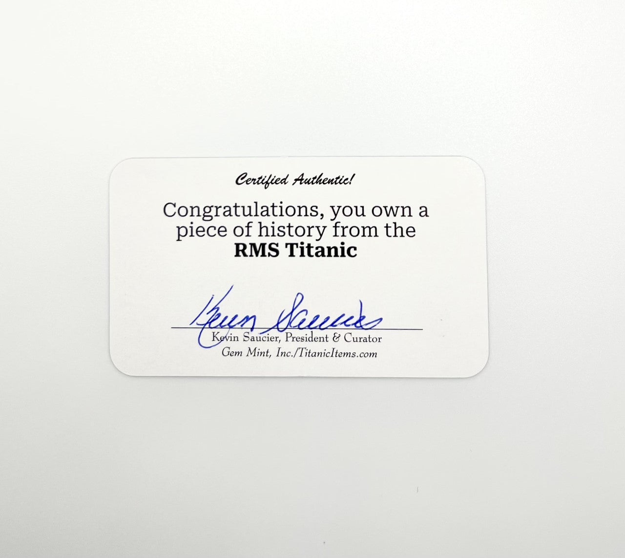 The real wood is positioned so that it appears as though it is coming from the artist breaking point of the deck. Like all other wreck wood offered on this site, it is yellow pine identified as part of the deck. It was found and recovered from the sea by the crew of the body recovery ship CS Minia in 1912. On back is the simple Certificate of Authenticity hand signed by Kevin Saucier, a respected 20+ year collector and researcher that is well-known in the hobby. Each will be shipped in a semi-rigid plastic sports card type top-loader.