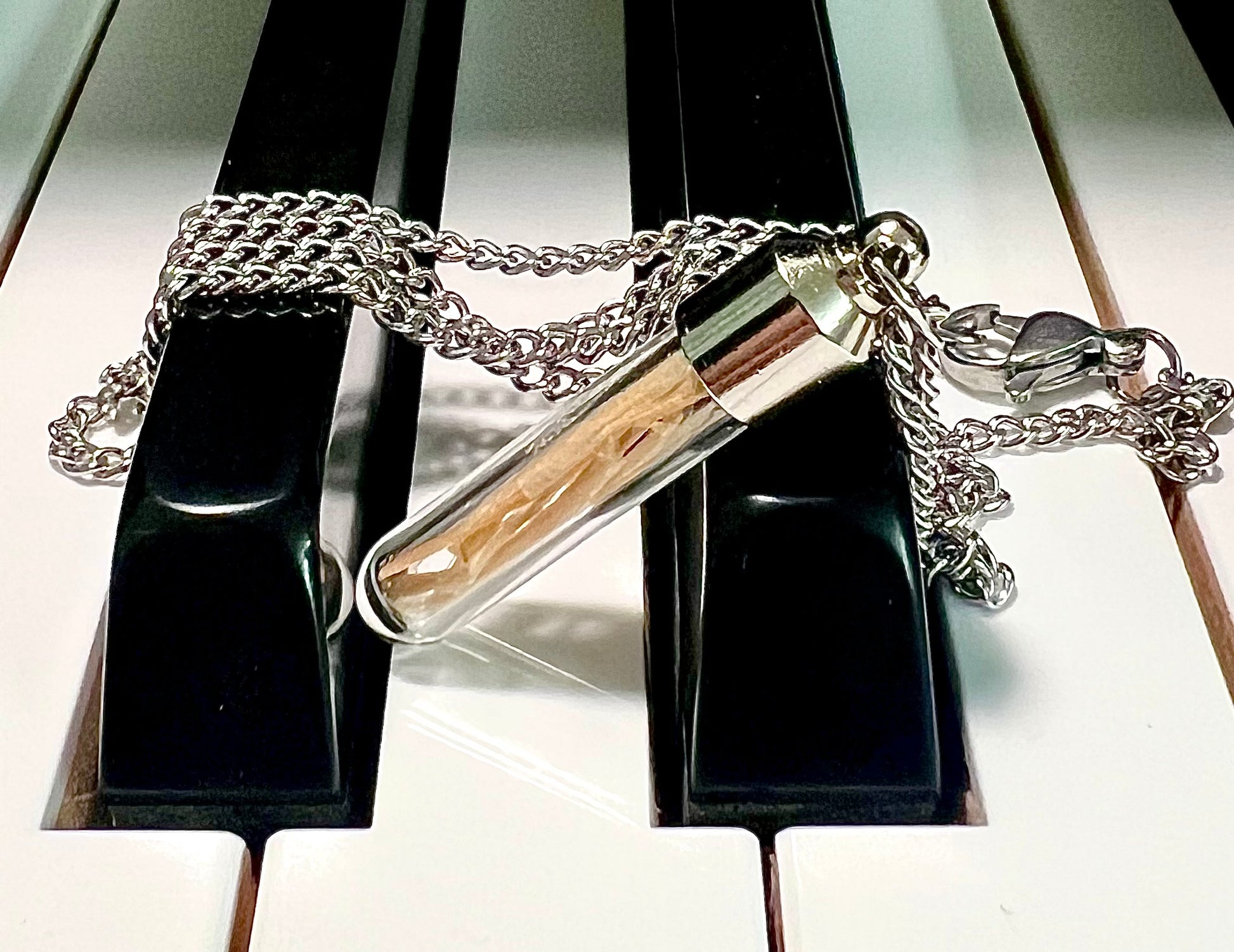 These have a secure screw top but have proved not to be completely water proof. Ready to wear pendant is about 1.25” with an 18” chain.